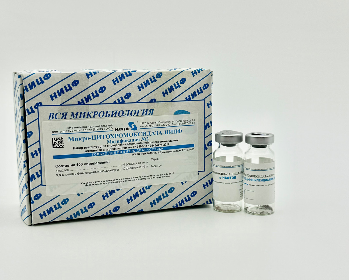 Набор реагентов для определения бактериальной цитохромоксидазной активности. Микро-ЦИТОХРОМОКСИДАЗА-НИЦФ в модификации № 2 по Эрлиху (двухкомпонентный состав) на 100 анализов.
