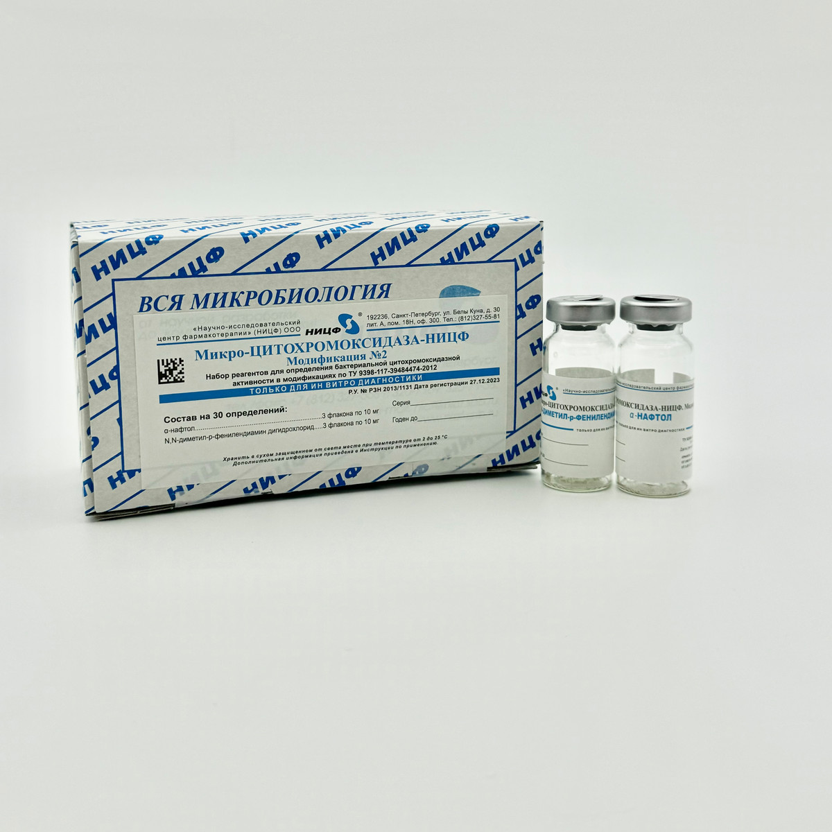 Набор реагентов для определения бактериальной цитохромоксидазной активности. Микро-ЦИТОХРОМОКСИДАЗА-НИЦФ в модификации № 2 по Эрлиху (двухкомпонентный состав) на 30 анализов.