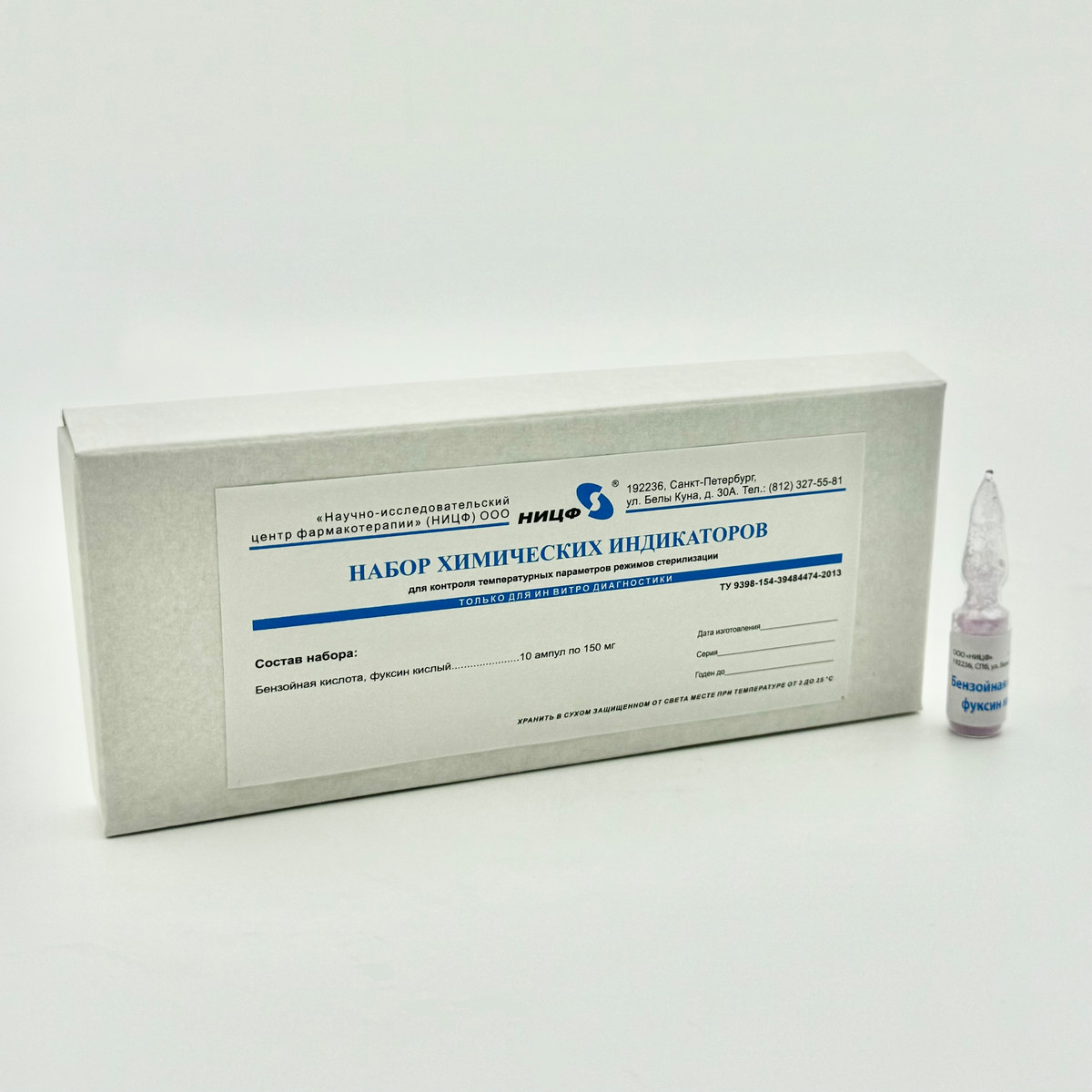 Набор химических индикаторов для контроля температурных параметров режимов стерилизации при 120 гр. Цельсия с бензойной кислотой,10 амп.