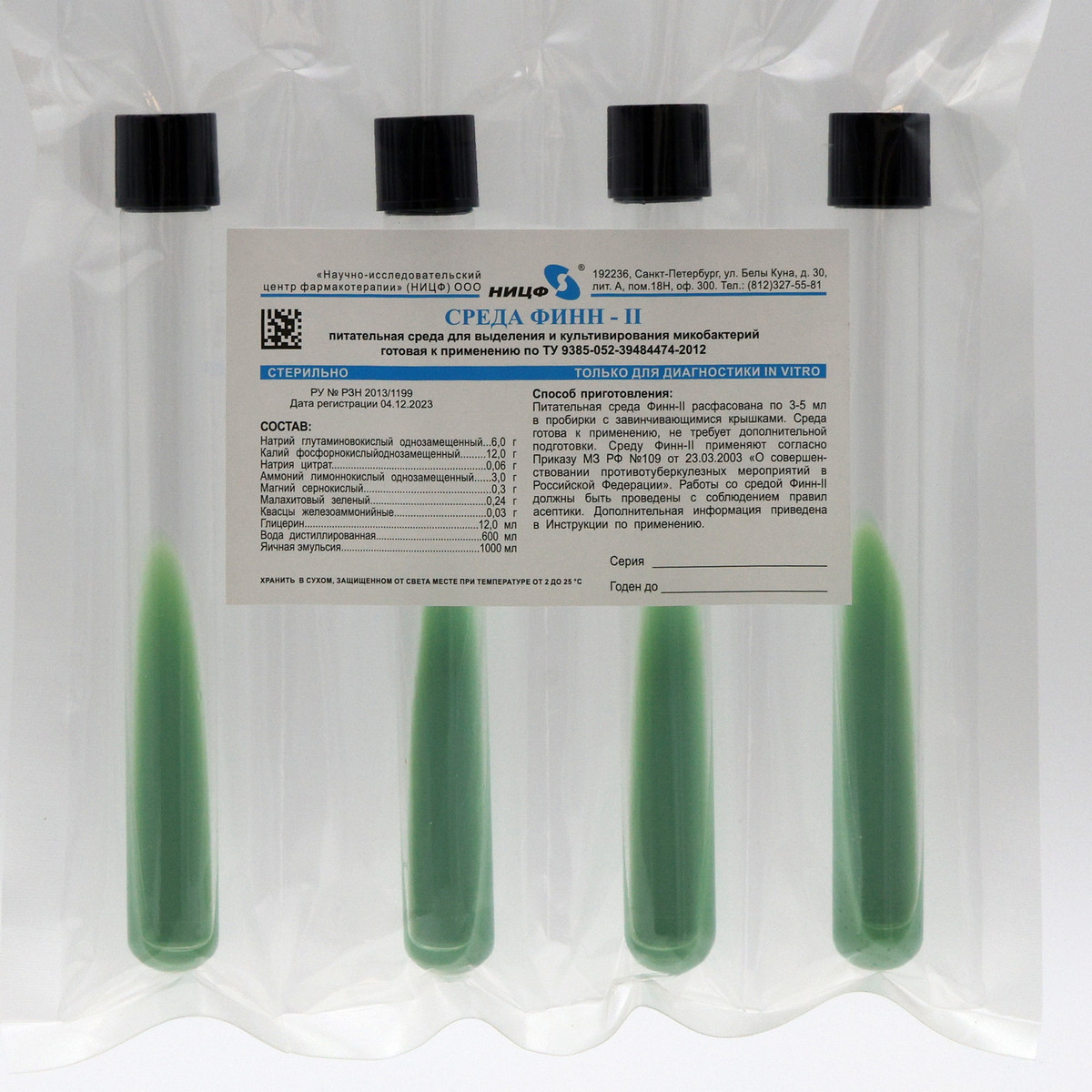 Питательная среда для культивирования и выделения микобактерий готовая к применению. Среда Финн-II в пробирках с винтовой пробкой по 5 мл.