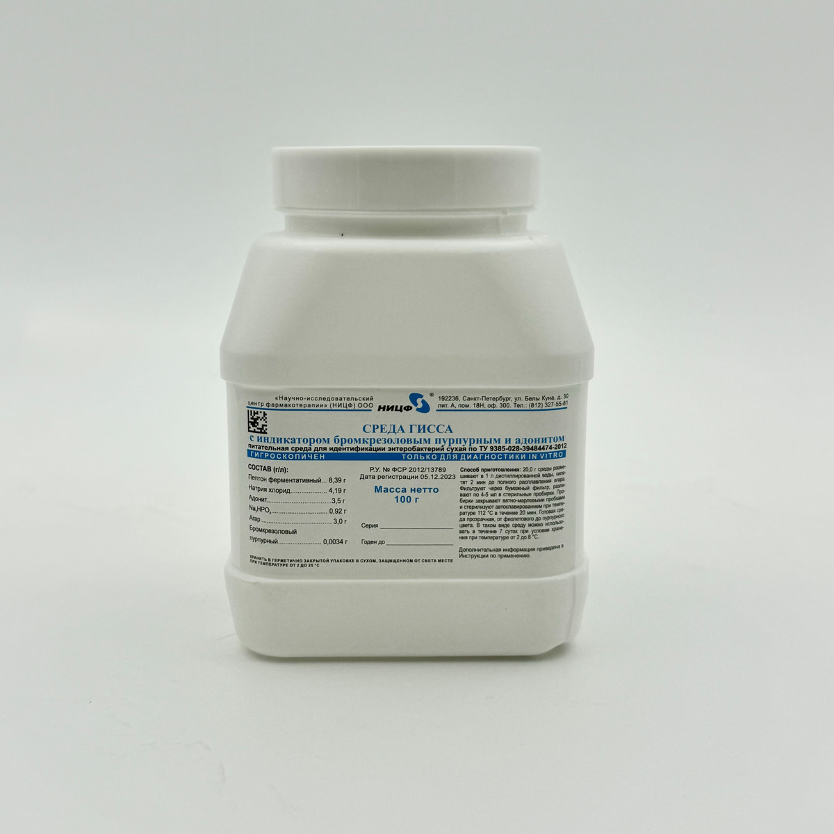 Питательная среда для идентификации энетеробактерий сухая. Среда Гисса с индикатором бромкрезоловым пурпурным и адонитом. 0,1 кг.