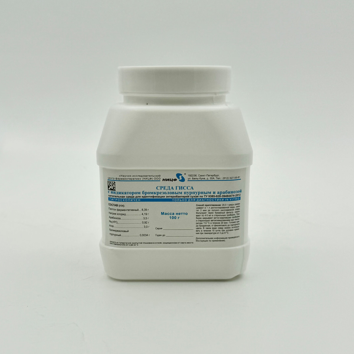 Питательная среда для идентификации энетеробактерий сухая. Среда Гисса с индикатором бромкрезоловым пурпурным и арабинозой. 0,1 кг.