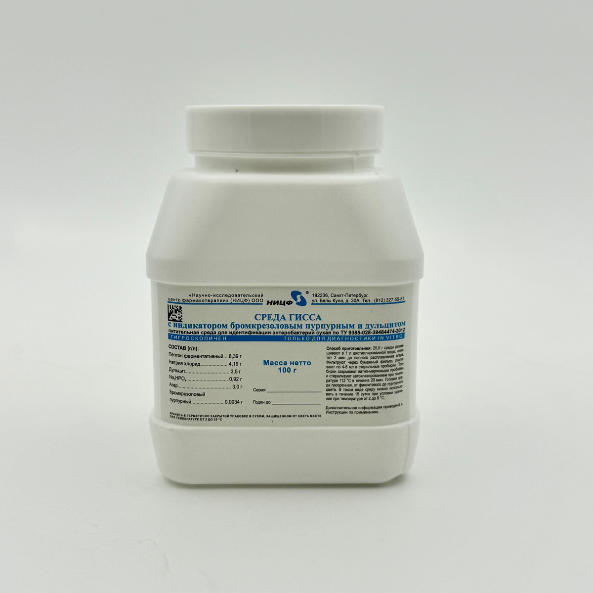 Питательная среда для идентификации энетеробактерий сухая. Среда Гисса с индикатором бромкрезоловым пурпурным и дульцитом. 0,1 кг.