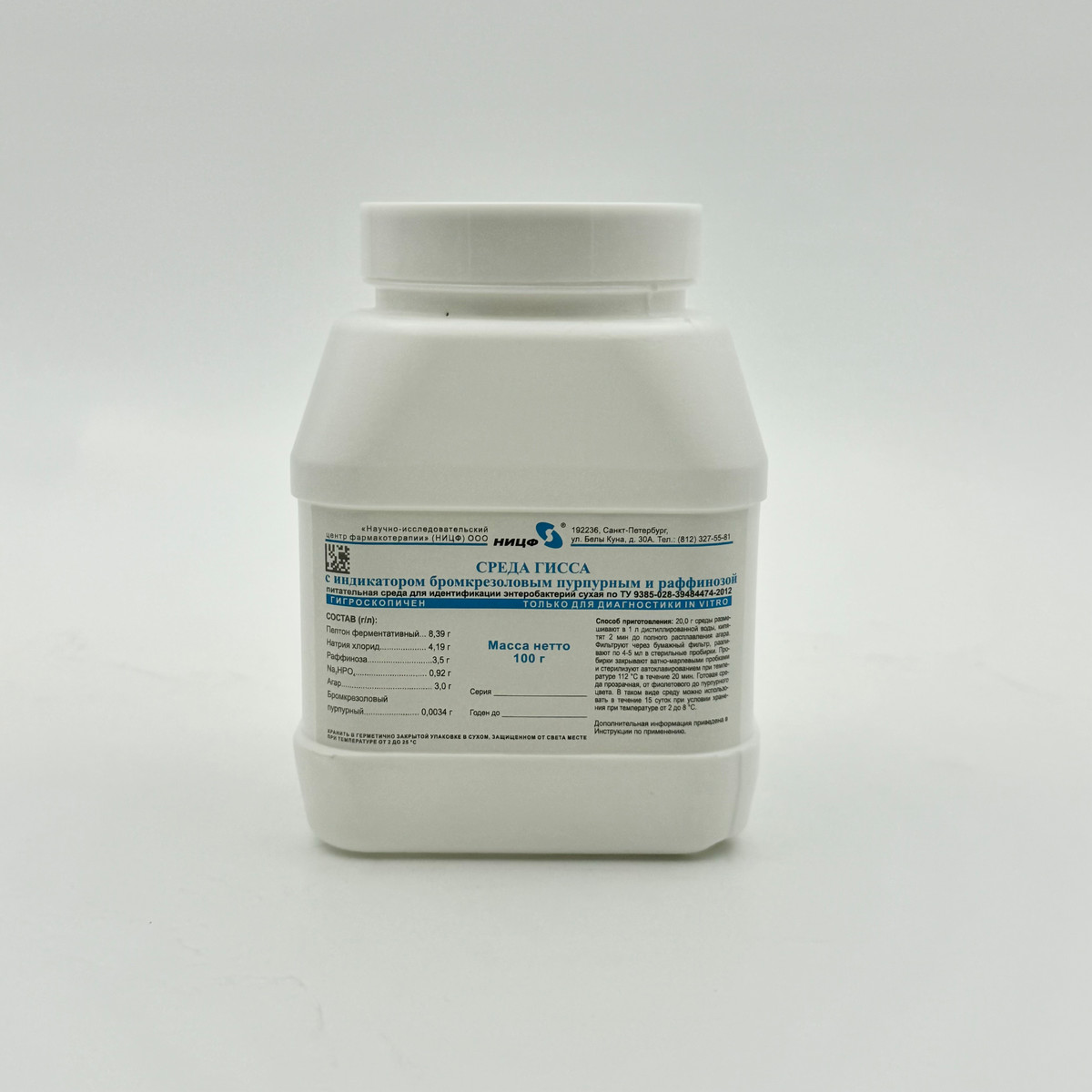 Питательная среда для идентификации энетеробактерий сухая. Среда Гисса с индикатором бромкрезоловым пурпурным и раффинозой. 0,1 кг.