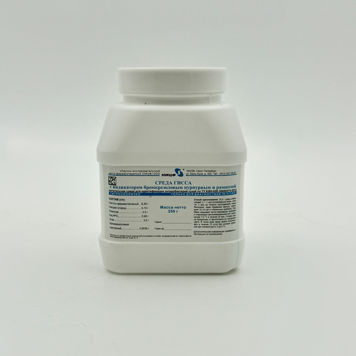 Питательная среда для идентификации энетеробактерий сухая. Среда Гисса с индикатором бромкрезоловым пурпурным и рамнозой. 0,25 кг.