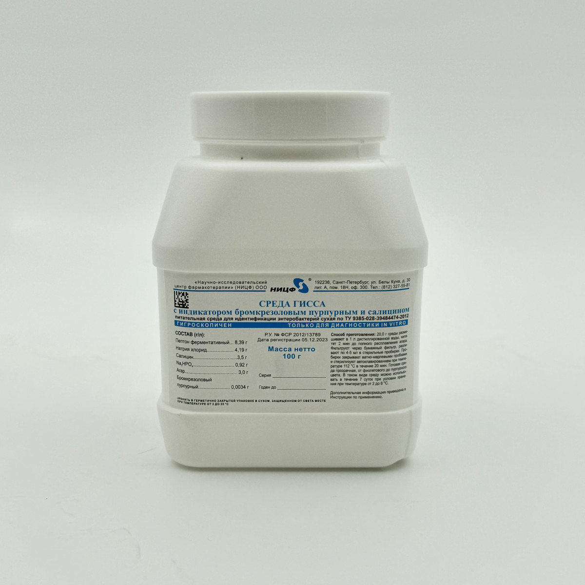 Питательная среда для идентификации энетеробактерий сухая. Среда Гисса с индикатором бромкрезоловым пурпурным и салицином. 0,1 кг