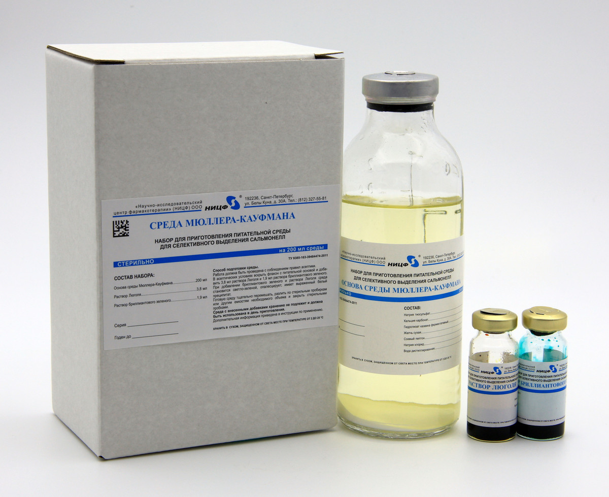 Среда Мюллера-Кауфмана является селективно-обогатительной средой для выделения сальмонелл. Рост сопутствующей грамположительной микрофлоры подавляется раствором Люголя, и раствором бриллиантового зеленого.