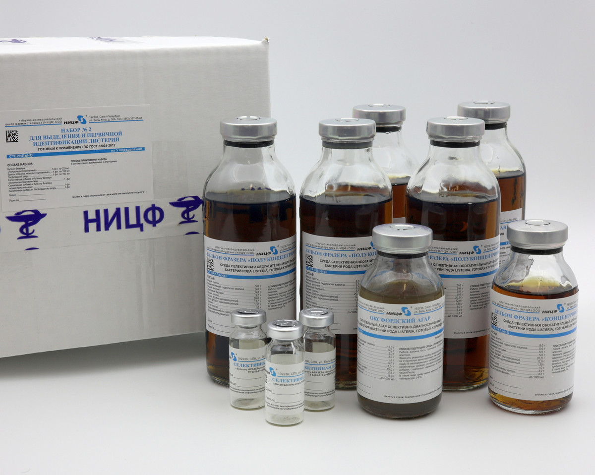 Набор № 2 для выделения и идентификации листерий на 5 определений. Состав: бульон Фразера «полуконцентрированный» - 5 фл. по 225 мл; бульон Фразера - 1 фл. /100 мл; Оксфордский агар - 1 фл./100 мл; селективная добавка для бульона Фразера «полуконцентрированного» - 1 фл.; селективная добавка для бульона Фразера - 1 фл.; селективная добавка к Оксфордскому агару 1 фл.