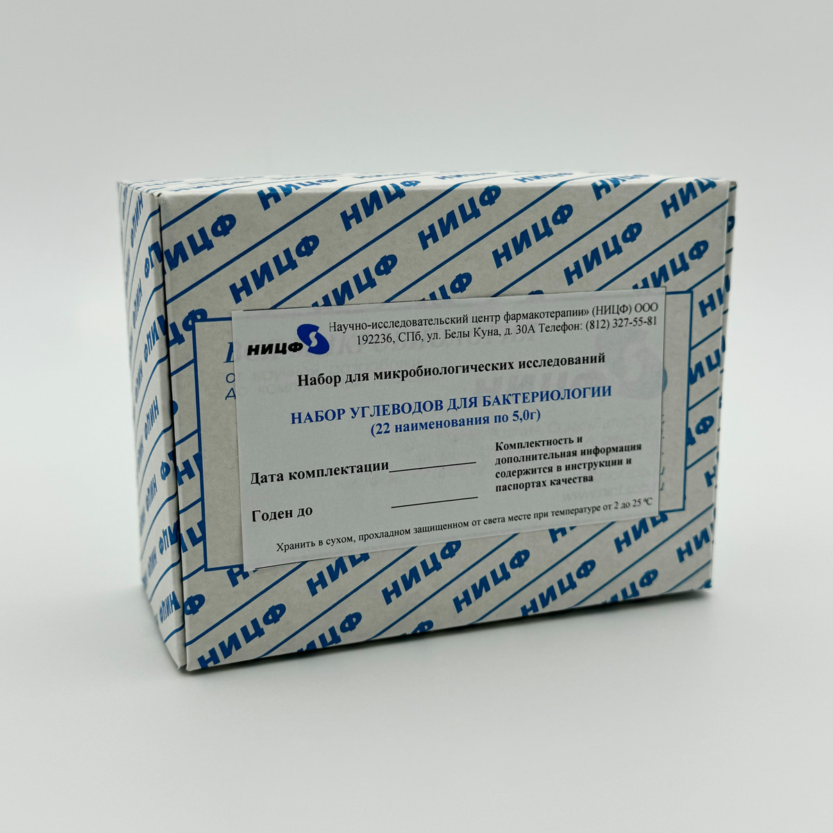 Набор сахаров для идентификации бактерий по 5 г (22 наименования): адонит, арабиноза, арабитол, глюкоза, дульцит, инозит, ксилоза, лактоза, малонат, мальтоза, маннит, манноза, мелибиоза, рамноза, раффиноза, салицин, сахароза, сорбит, трегалоза, целлобиоза, эритрит, эскулин.