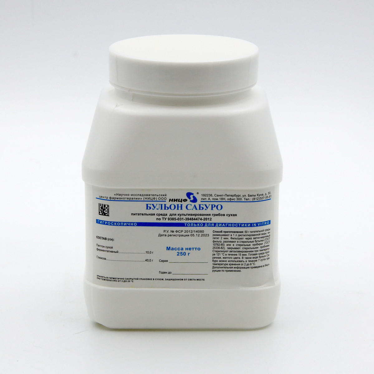 Питательная среда для культивирования грибов (бульон Сабуро) сухая, предназначена для выделения и культивирования различных сапрофитных и патогенных грибов, включая дрожжеподобные грибы рода Candida, Cryptococcus, из клинического материала (образцы пораженных волос и ногтей, соскобы с кожи и слизистых, образцы мочи, кала, мокроты, материал, полученный при биопсии и аутопсии), пищевых продуктов, пищевого сырья и объектов внешней среды. Также бульон Сабуро предназначен для испытания на стерильность.